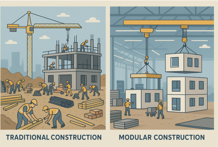 The main difference is where and how the building comes together. Traditional construction mostly happens at the building site, with workers and materials brought in as needed. This makes it very sensitive to problems like bad weather and requires a lot of on-site planning and coordination.